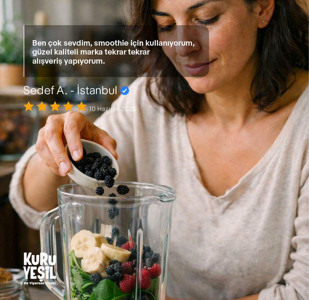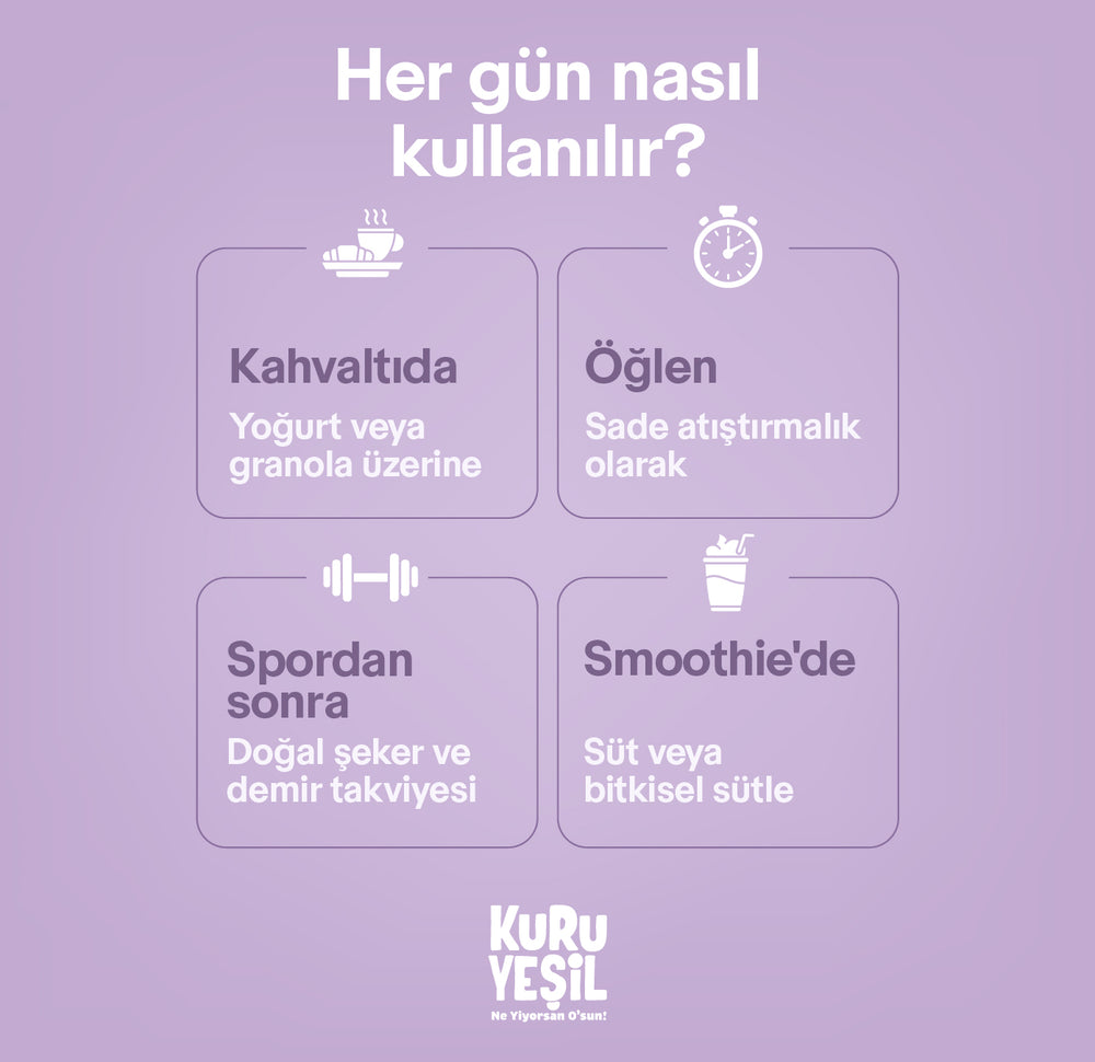 Tüm Kuru Yeşil ürünleri tamamen doğaldır. Ürünlerimizde yapay tatlandırıcı, koruyucu, renklendirici ya da herhangi bir kimyasal katkı maddesi kullanılmamaktadır. Her zaman doğanın saf ve temiz halini sunmaya özen gösteriyoruz.